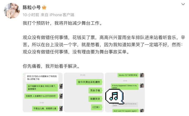 你的位置:云手机app下载安装 > 新闻动态 > 歌手陈粒演出中耳机爆炸, 坚持完成演唱后发文称“将开始减少舞台工作”, 透露此类事故已发生3次